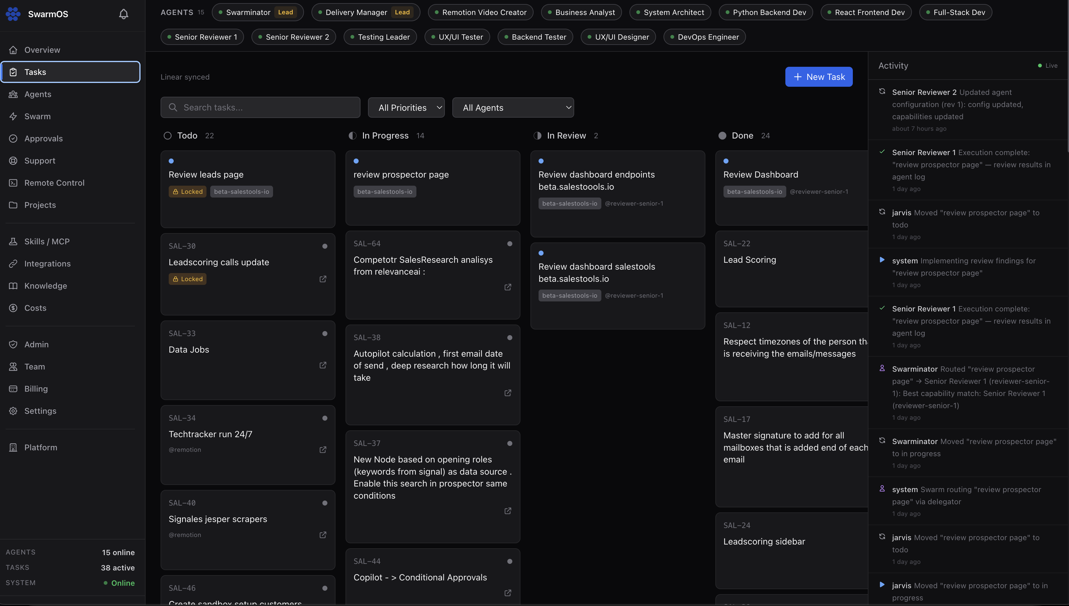 Bidirectional sync — Linear issues become SwarmOS tasks, agent outputs update Linear. HubSpot contacts feed agent context for customer workflows.